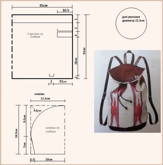 - Having fastened the smaller edges with an even seam, you will get a cylinder, based on the diameter of which you should cut out the bottom of the backpack in the form of an even circle. In the form of a half of an oval, we cut out the upper part of the backpack, which will cover the ties, for a more aesthetic appearance, and are sewn up with a closing element.