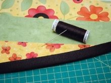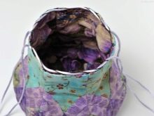 Contrast edging is attached to the upper edge (departing from the edge of the upper edge of the front side, 3 cm). Then collect and sew handles. The lining is cut out in height more (for the lock-curtain). The upper edge stitch seam in the hem, leaving an allowance for threading the lace. Then the lining is connected to the top of the base, threading the cord and fixing its ends with decorative stops.