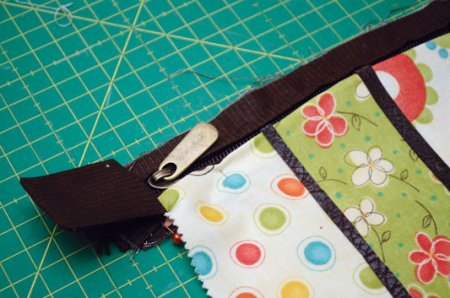 - Multicolored stripes sew together, forming two solid canvas of the desired size in the form of a rectangle. Also come with details of the sidewalls.Leather strips are applied to the seams of the flap joint and attached with a decorative stitching.
