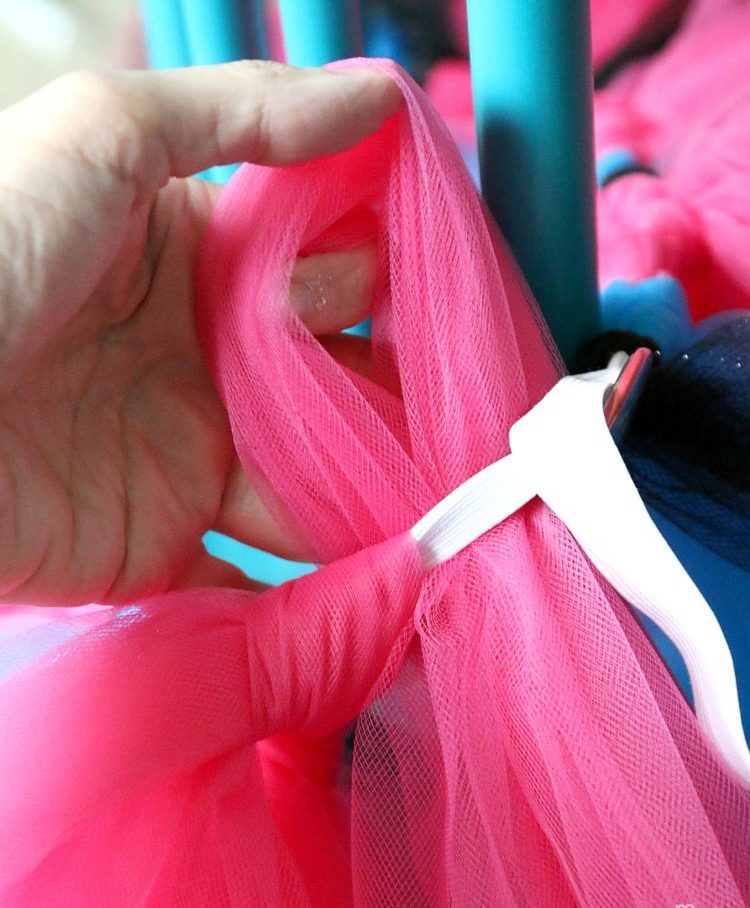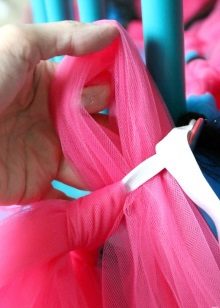 - Twist a small roll from each strip of tulle, find the middle and tie a twisted tulle around the elastic band with a regular knot. You need to make sure that you do not squeeze the gum and at the same time tie the tulle so that its strip does not dangle. In addition, the ends of all tulle cuts should be obtained after tying the same length, if you do not intend to make them different.