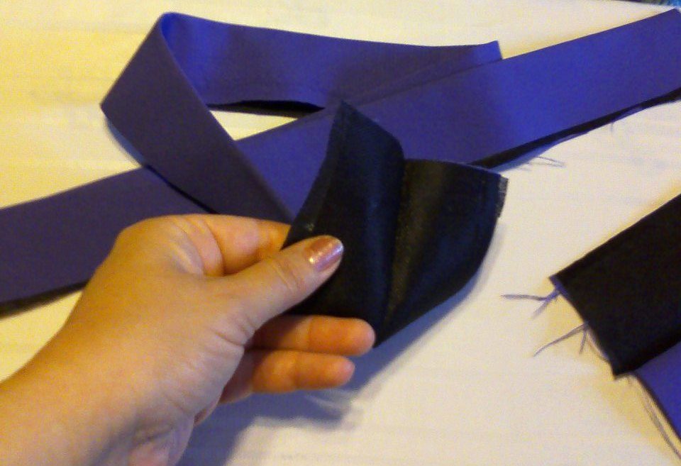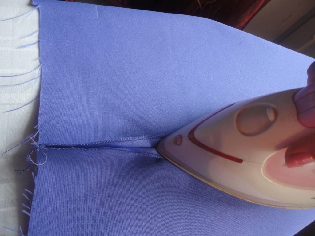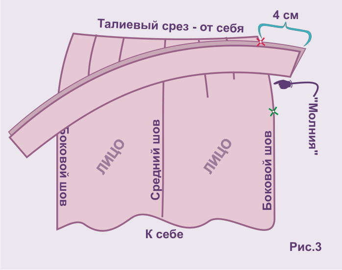 Next, we make a belt. To do this, cut a rectangle that is equal in length to the waist circumference, and twice as wide as the desired width of the belt of the future skirt. We process as shown in the picture. We sew to the upper edge of the skirt from the seamy side.