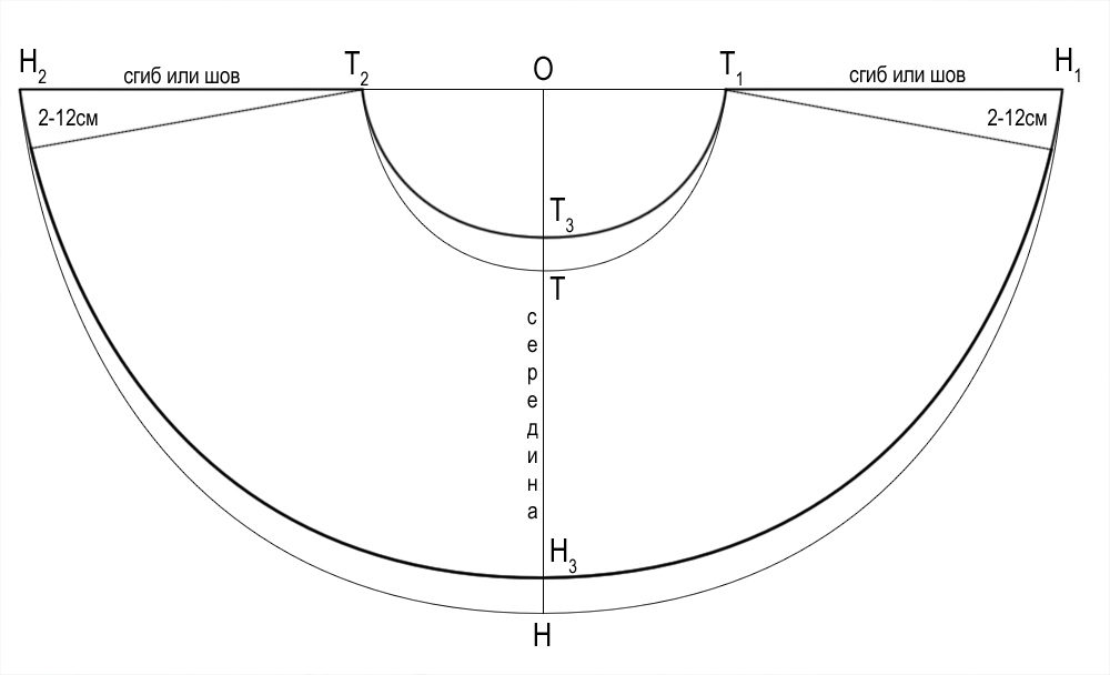 - Take the circumference of the diameter specified above, attach it to the control point so that its middle passes through the fold line, and draw. This is your top skirt cut line.