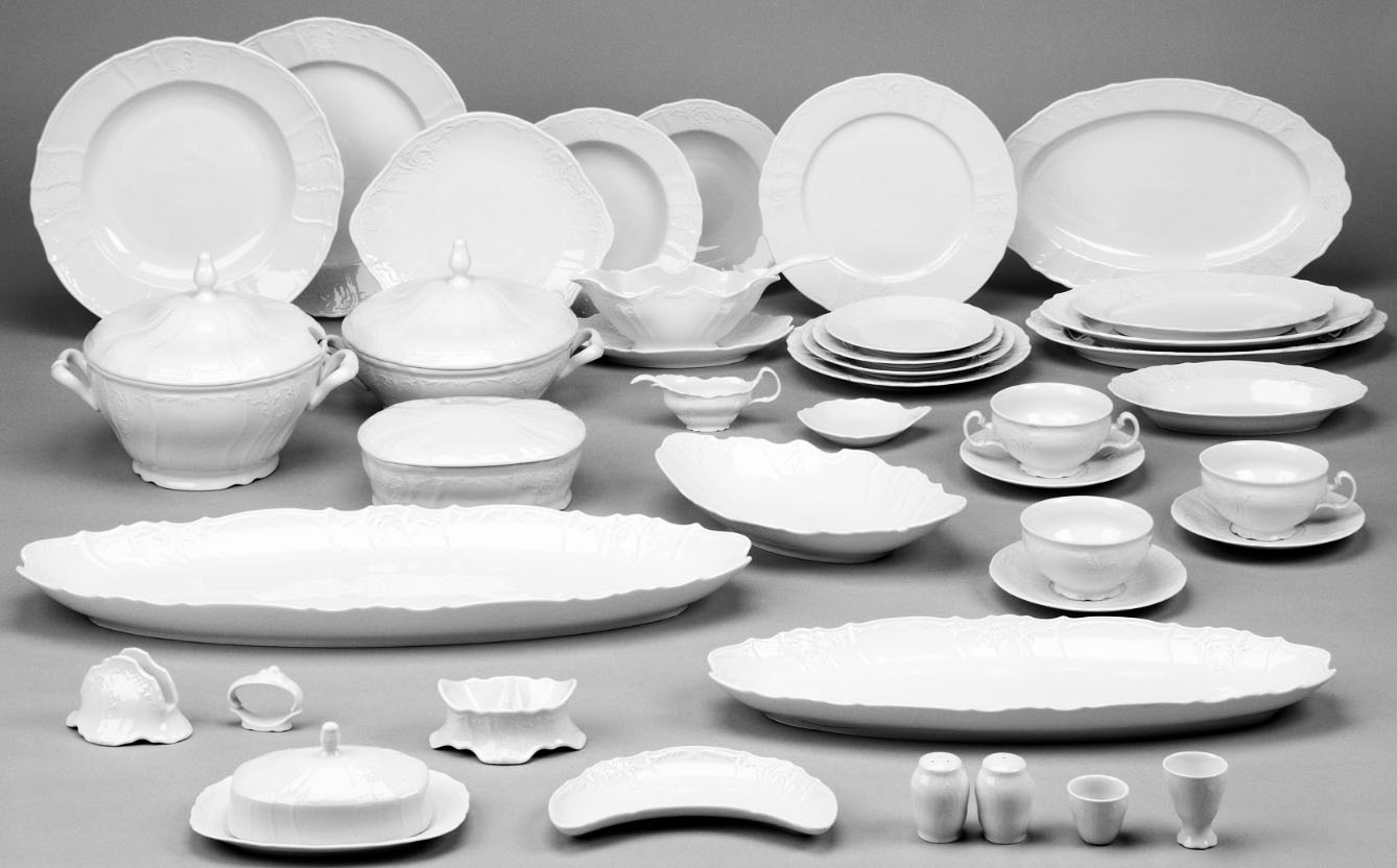 The first set includes a tureen, 2 large dishes, 2 bowls, a sauce-dish with a stand, a device for spices, as well as dessert and deep plates of 6 pieces each. The second option is complemented by a third large dish, a third salad bowl, butter dish and mustard. As for the plates, there are 4 varieties for each person. The set includes dessert 17-centimeter, 19-centimeter, shallow and deep plates (12 each).