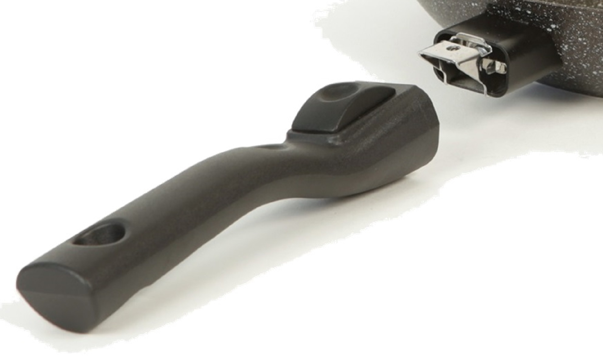 - Push-button mechanism. This is a simple and convenient option, as it requires only pressing a special button on the chapel and lifting the handle up.This method is very popular among chefs, as it takes only a few seconds, and you can cope with the mechanism with the help of one hand. But pressing the button is required strongly, otherwise the handle will not detach.