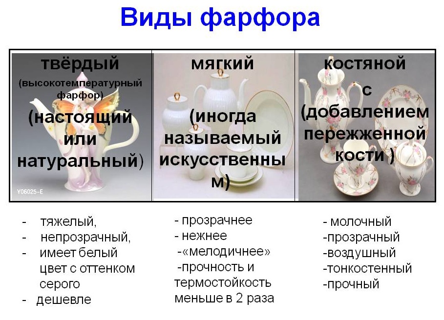 The material itself can be hard and soft. Solid is obtained by double firing under the action of a temperature in excess of +1350 degrees. Soft porcelain is fired at a lower temperature. Visually, it is indistinguishable from solid, although experts consider it to be more fragile material. Hard porcelain is European (the main part of the composition is classical clay) and eastern (not so much kaolin is in its composition). Soft porcelain is European, English and, of course, French.
