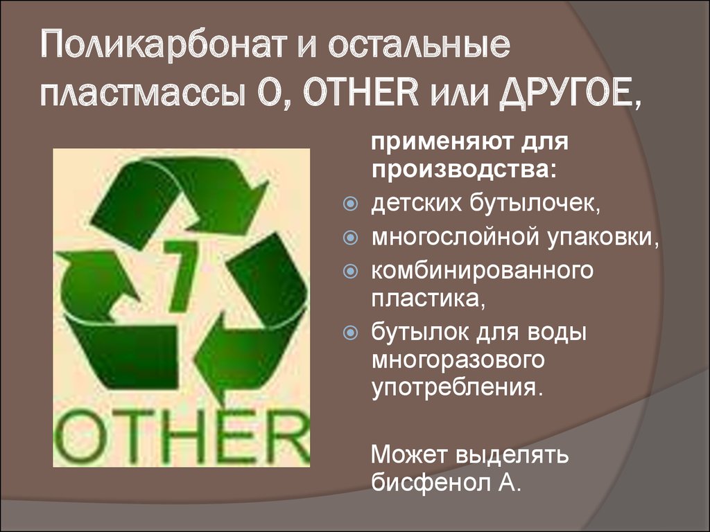- OTHER or O - other. These signs will tell the average person that this plastic cannot be classified under one of the above listed types. Usually refers to one of the safest species (conditionally) for people.