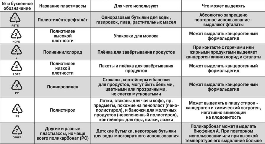 When choosing containers made of plastic, you should familiarize yourself with the decoding of the markers. On any plastic product there must be a special badge that tells what specific material this product is released from. If there are no icons on the product at all, then in no case should you buy it. For example, if there are numbers in the triangle icon at the bottom of the dishes or there are PVC letters, this is a signal to you that this kind of packaging is extremely poisonous.