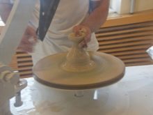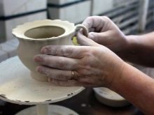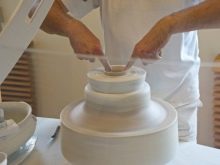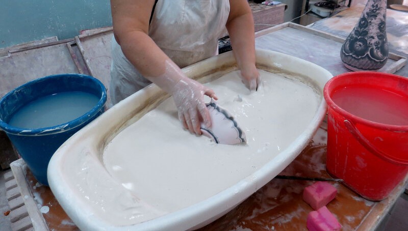 - Next, the workpiece is placed in a rotating plaster mold: the master puts pressure on the soft internal walls of the workpiece with a sponge, so the relief and structure of the matrix is transferred onto it. With this technique, create cups, bowls, teapots, jugs and other utensils.