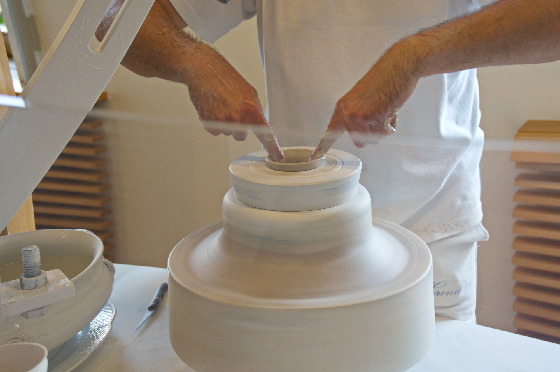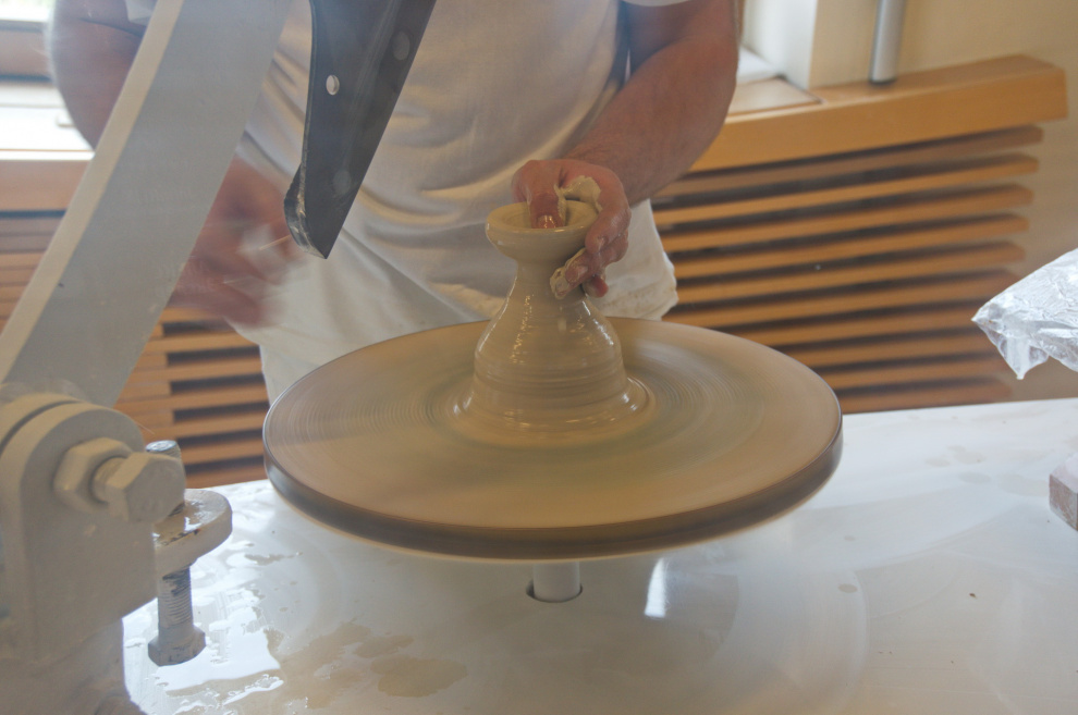 - And until now potters take part in the creation of Meissen masterpieces, they activate a potter's wheel with a foot. Wet palms of the master clasp the workpiece, which spins on a circle, the surface is cleared to homogeneity. After this, the master can manually change the shape of the product.