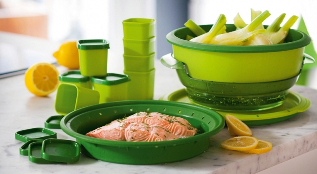 On tiers laid pre-prepared products. It is recommended to use the lower basket for cooking meat and fish. The temperature there will be higher, and these products require a longer preparation. The top basket is laid with side dishes and vegetables, which are steaming fast enough. Everything is covered with a lid and placed in the microwave.