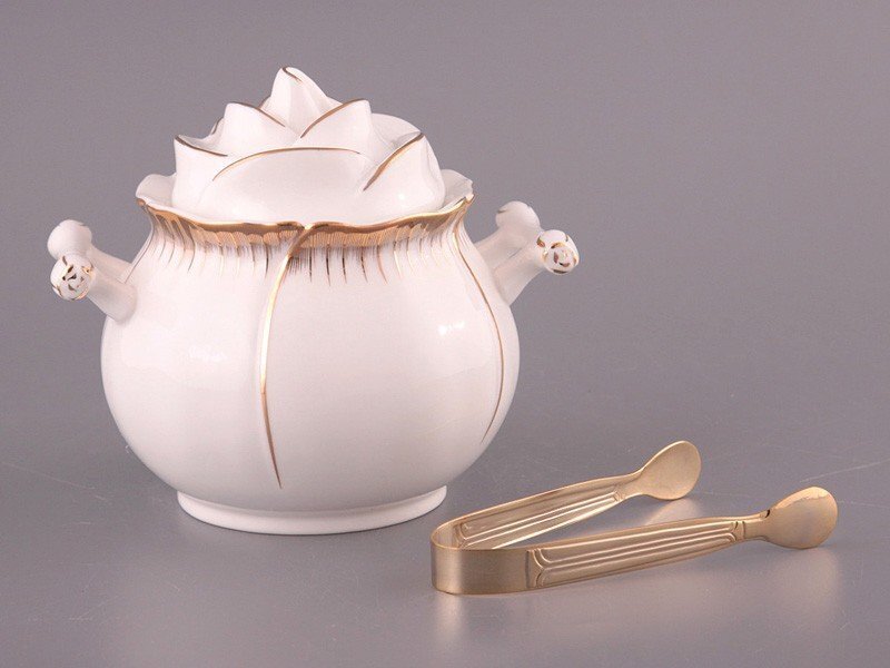Beautifully looks white sugar bowl with handles, decorated with gold painting. And the gilded tongs make the set original, giving it a noble and expensive look.