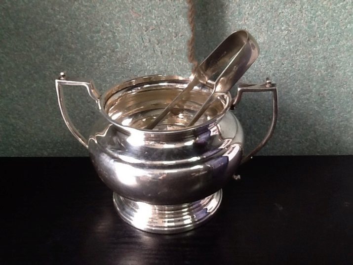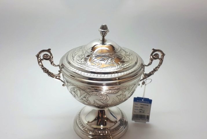 Such a silver sugar bowl is distinguished by complexity and refinement of execution. It will decorate your table and will last a long time.