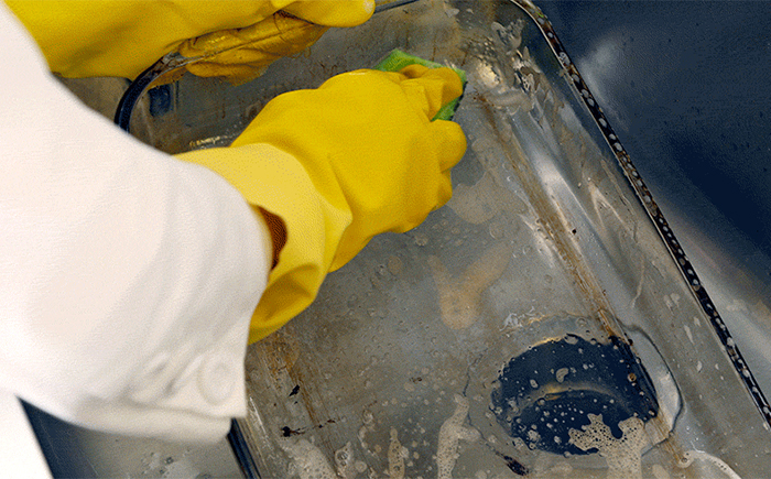 It is very easy to clean the dishes from the burned fat. For this it is not necessary to pre-soak it, because any contamination can be easily and quickly washed. Use should gel or other liquid cleaners and the most common sponge for washing dishes. Do not use abrasive cleansers and hard sponges.