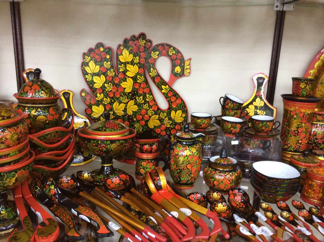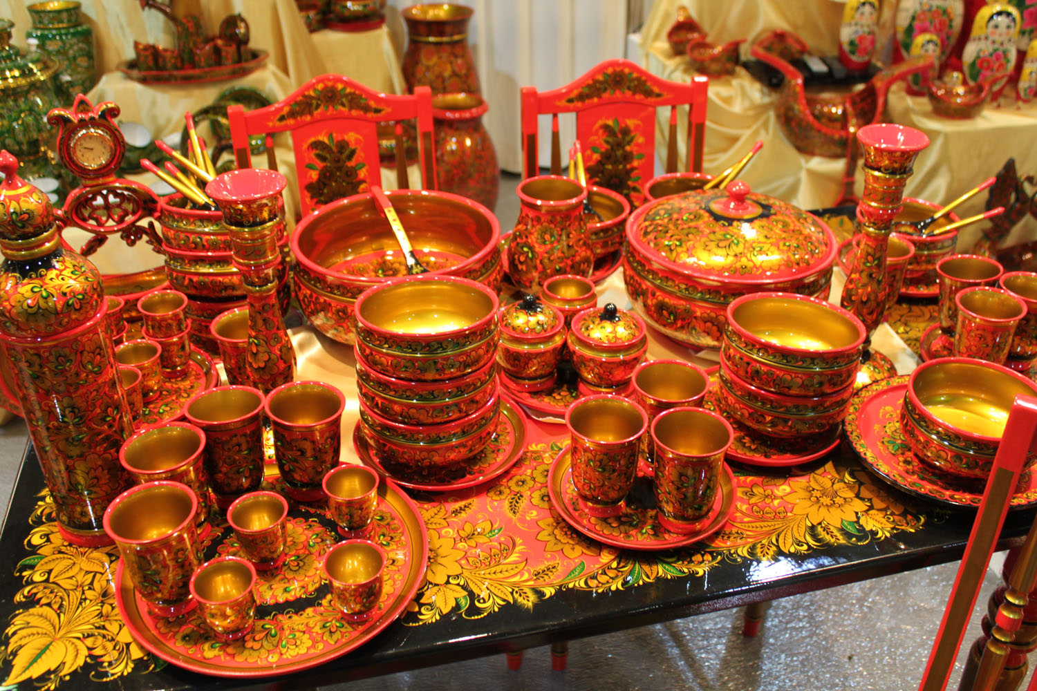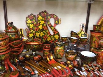 - Khokhloma, above all, - spectacular catchy painting, built on the contrast of color. Dominate black, yellow, red. This style is often used in the design of the kitchen, as it gives the room brightness and comfort. The diversity of colors balances the base of black color, so the overall impression of such dishes is quite cheerful. Khokhloma dishes are perfect for the decoration of the kitchen in the folk style.