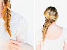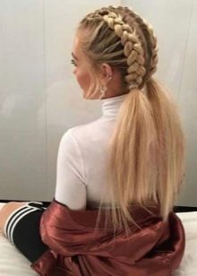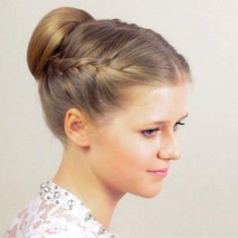 So that the hair does not interfere, and the hairstyle has an attractive appearance, you can braid the hair around your head in the French manner, removing strands from the face. From the hair it turns out something like a crown. The tip of the hair remains to be fixed in the tail and make a beautiful bunch in the back, in the center or behind the ear.