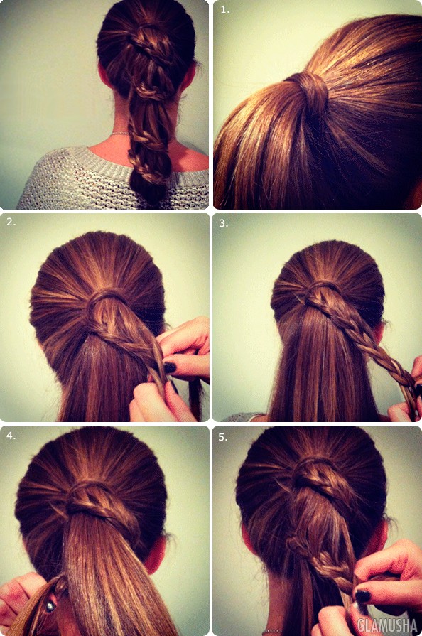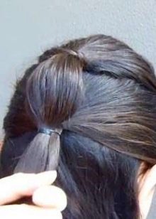 Long hair allows you to make such a weave on the basis of the usual tail - hair, collected by an elastic band and completely passed through it: