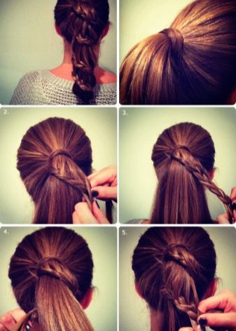 - distribute the strands in a circle and braid the pigtail, flying all the collected mass of hair in a row so that the “internal structure” of the hairstyle is not visible;
