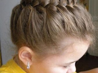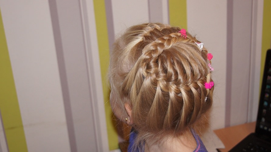 Carefully comb the hair of the child and slightly moisturize the naughty strands. On the left side we make a side parting and begin to weave a spikelet, “picking up” the lower hair. Spit should "go" in a circle. The tip of the ear is fixed "invisible." This “basket” of hair will sparkle with bright colors if it is decorated with decorative hairpins with flowers.