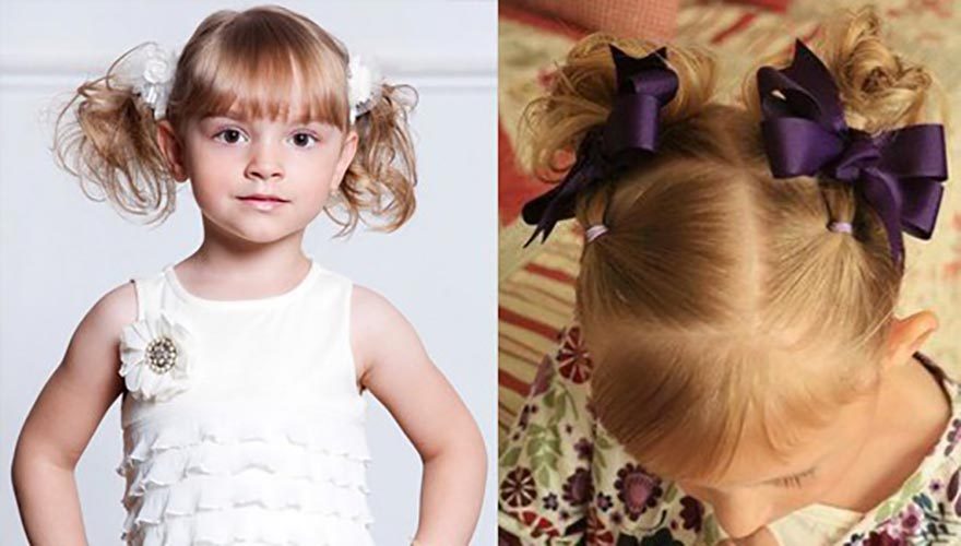 For a New Year's party or a birthday celebration, the hairstyle of the young charmer can be decorated with satin bows or a bright rim. For example, carefully comb and divide hairs into two equal parts. On each side we make high tails and fasten them with colorless rubber bands. We take two beautiful satin ribbons and tie them on each tail (we get two pretty bows). The ends of the strands curl with curling. Cute little girl with such a hair will not leave anyone indifferent!