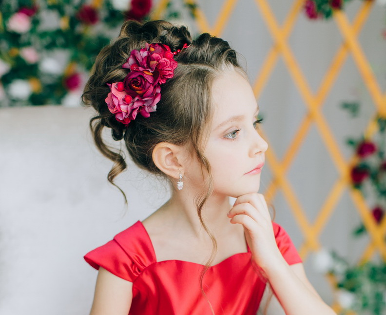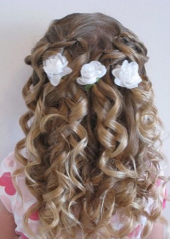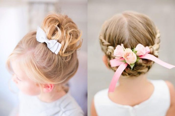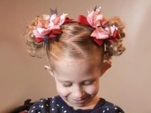 Any festive hairstyle must be complemented by stylish decors - sparkles, bows and beautiful hairpins with flowers. If a girl's hair is too soft and literally flies out when trying to lay it, it is better to make an ordinary tail and create hairstyles based on it. For owners of tight curls, funny tails are suitable at the top of the head - if the girl has short or medium hair - they are quite enough, but for longer strands it is better to spin them additionally in buns.