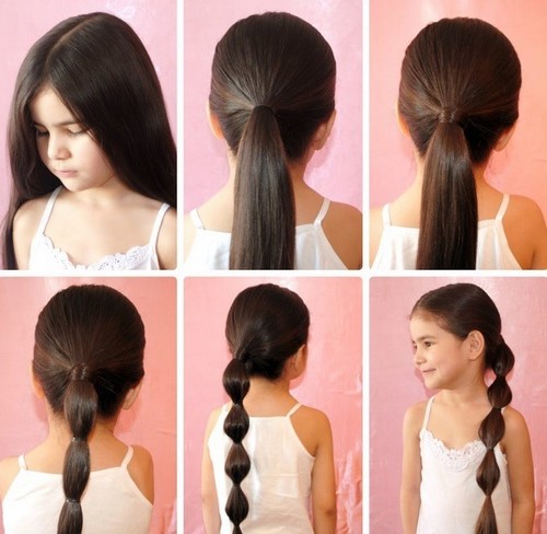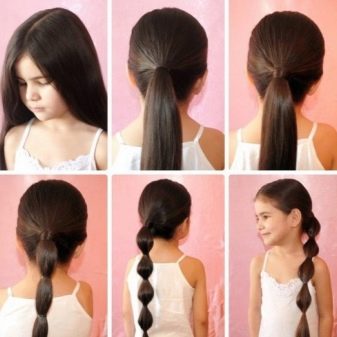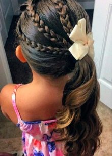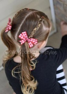 Usually they collect a pair of tails high on the crown, and owners of curly hair can collect many tails all over their heads. And with the help of beautiful accessories you can make even the simplest tails elegant and festive through the use of satin ribbons, small colored bows and stylish hairpins. In this form, the girl can be sent to any special event. To create a set of tails, it is better to use soft elastic bands or silicone - they firmly fix the hair and at the same time do not cause the child the slightest discomfort.