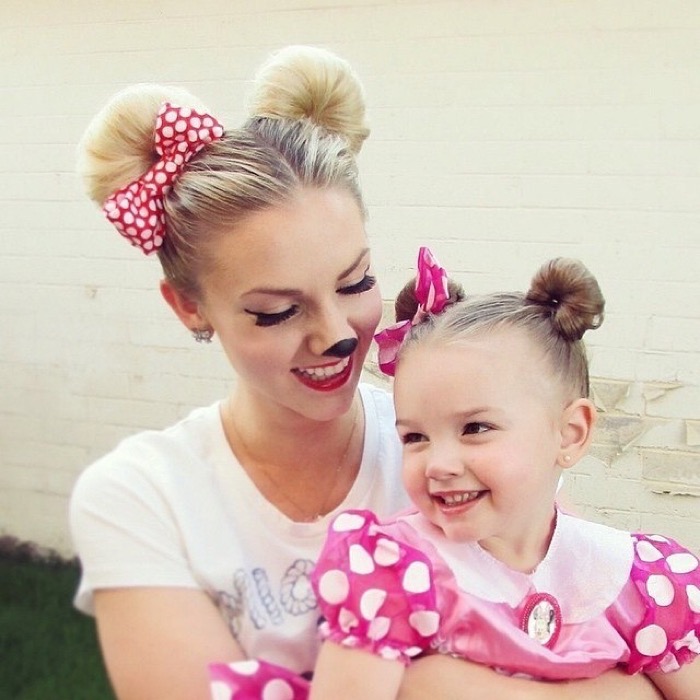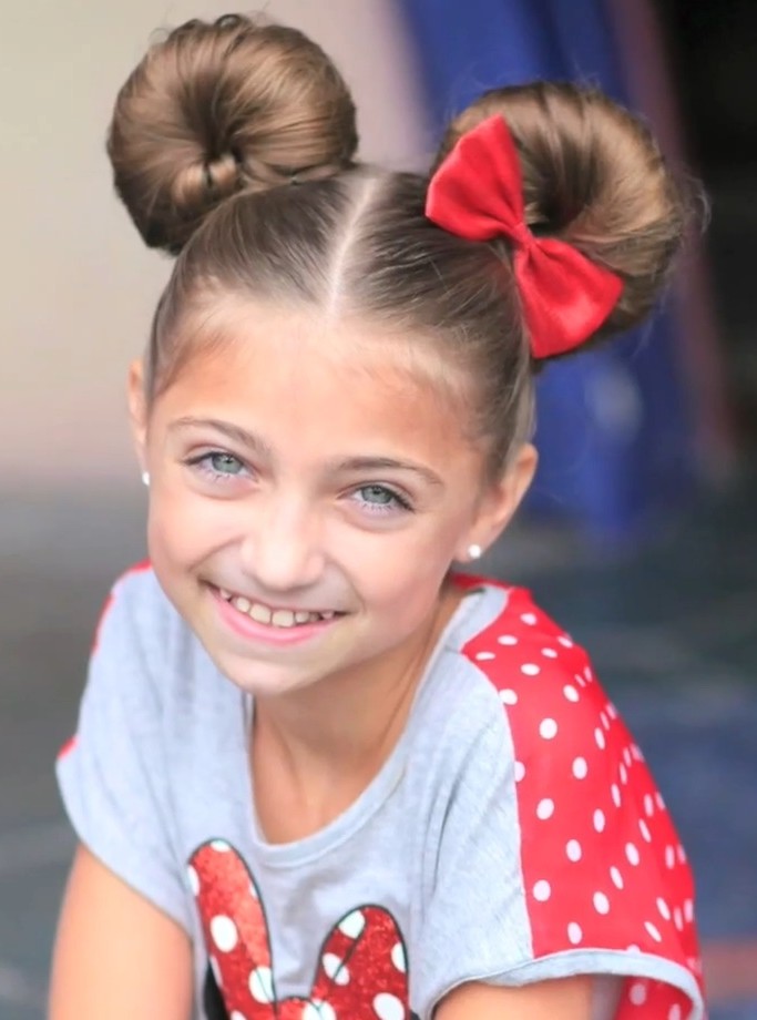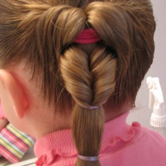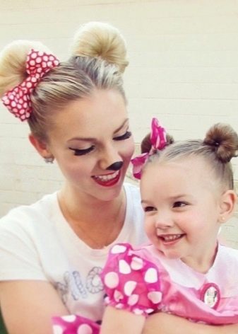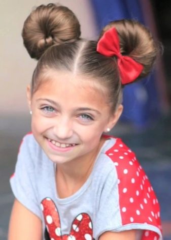 For the most fun and mischievous girls fit the ears of a favorite cartoon character - Mickey Mouse. This is a good hairstyle for very long hair. Initially, two tails are collected at the top of the head, clamped with rubber bands, and a bun is made from the remaining hair. A similar hairstyle can be done both as a daily and as a holiday option.