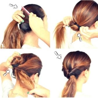 Another interesting option is the tail inside out. To create this delicate hairstyle, the strands are collected from below and secured with an elastic, then slightly loosened and pulled down slightly. Without lowering the resulting tail, the section above the rubber band is divided by fingers into two parts and the end of the tail is pulled into the formed opening. The turned tail is considered a self-sufficient hairstyle and does not need any additional decors.