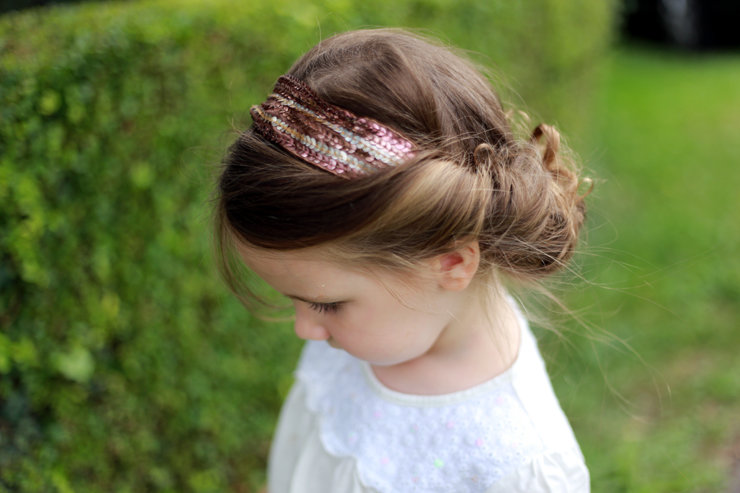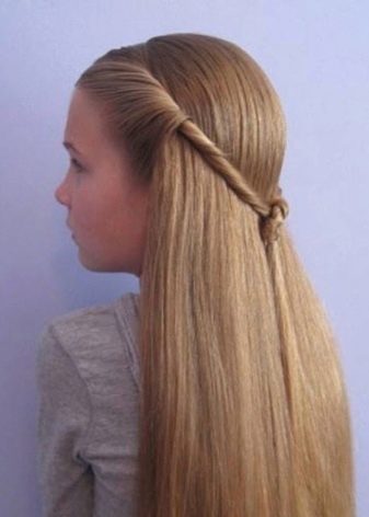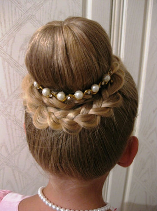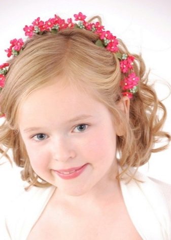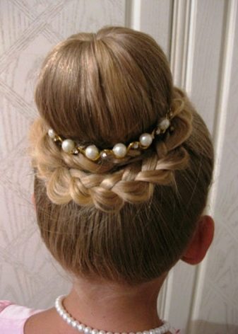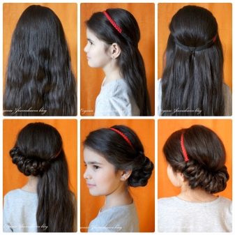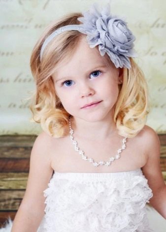 The easiest way to create a festive hairstyle for the baby is to design the hair in a delicate Greek style. To create it, you will need either an artificial braid on an elastic band or a special bandage, however, you can also use a regular cord, just not silk. The cord is worn so that it is located on top of the hair, while on the forehead it should be higher than on the back of the head. All strands are twisted, slightly combed and tucked on a bandage so that it is completely curled. Hairstyle is best obtained from medium-length strands.
