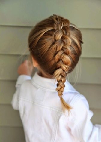 Choosing styling options for a 4-5 year old baby with long hair, you must be able to do styling that allows you to collect hair so that she does not climb into your eyes, do not interfere with playing games and does not distract from other interesting activities. The most popular hairstyles are all sorts of braids - the most common, French or cone. The French braid is an extremely simple way of weaving, every mother must be able to do it, because the technique is considered the basis for creating many other styles. The braid is weaved from three strands, gently crossing them among themselves, and as weaving, the side curls are woven to them. Some also call a similar hairstyle "dragon".