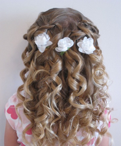 Wavy strands are best suited to create a festive hairstyle, however, you should not use a curler to curl them - such a perm takes too much time, besides, a restless girl can get burned by chance. Large curlers are also not suitable, because it will be inconvenient for a baby to sleep on them, the best thing is to simply twist the flagella and leave for a few hours until the hair is completely dry.