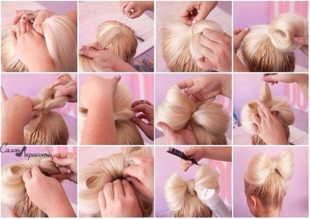 For graduation in kindergarten, you can make a bow of hair, this hairstyle looks very impressive, while it can be done in just 5 minutes. First you need to collect a high tail on the top of the crown itself, but at the very last grip of the strands, they do not need to be pulled out completely - You must have a small tuft and the tip of the hair, you need to pull it in the direction of the back of the head.