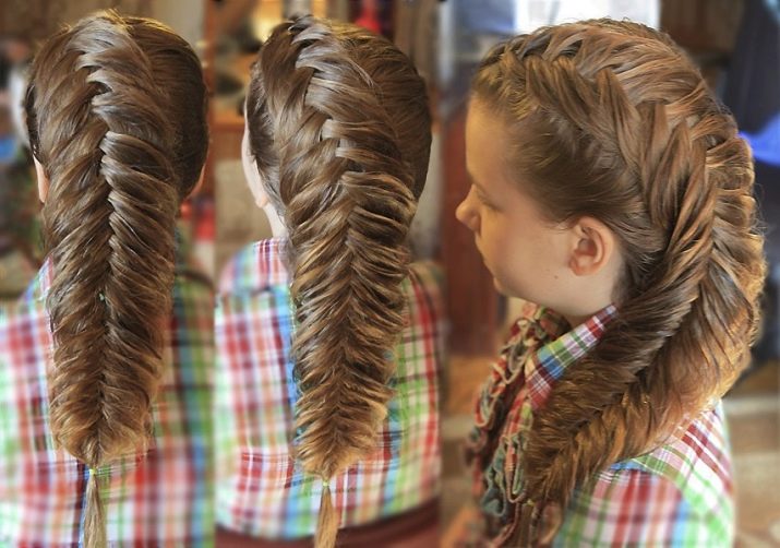 When creating a fishtail styling, try to grab as thin as possible strands, so the hairstyle will be more voluminous and refined. With a great desire, such weaving can be varied and braided two braids on the sides.
