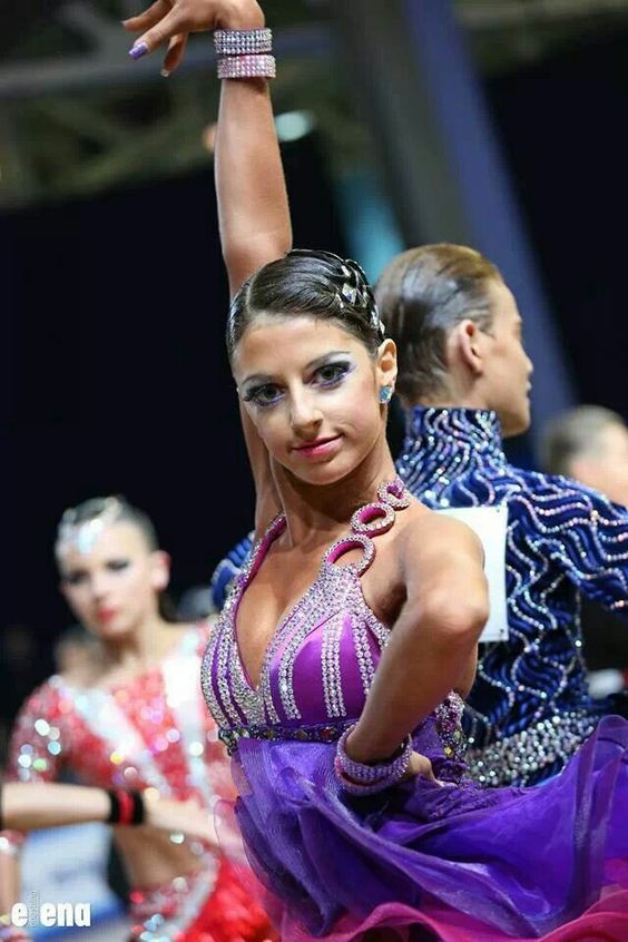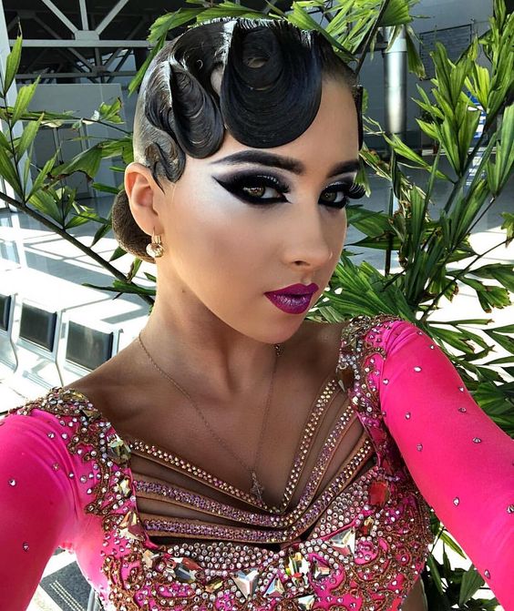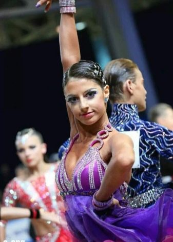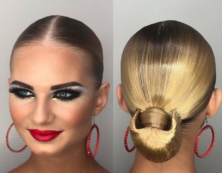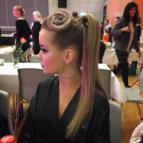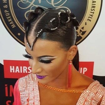 - Accuracy. For ballroom dancing, smoothness and neatness of the hairstyle are particularly important. It can be various bunches, tight tails and tightly folded curls. Different bouffants, fluffy tails and bangs are by no means suitable either for a ballroom dance competition or for regular performances.