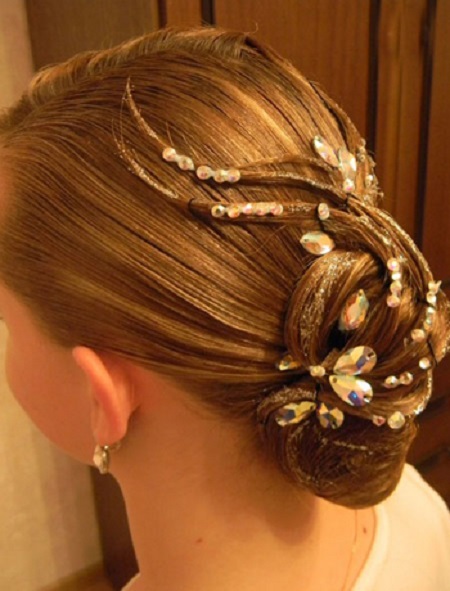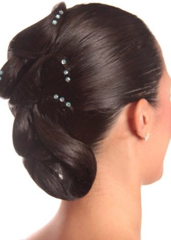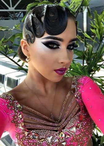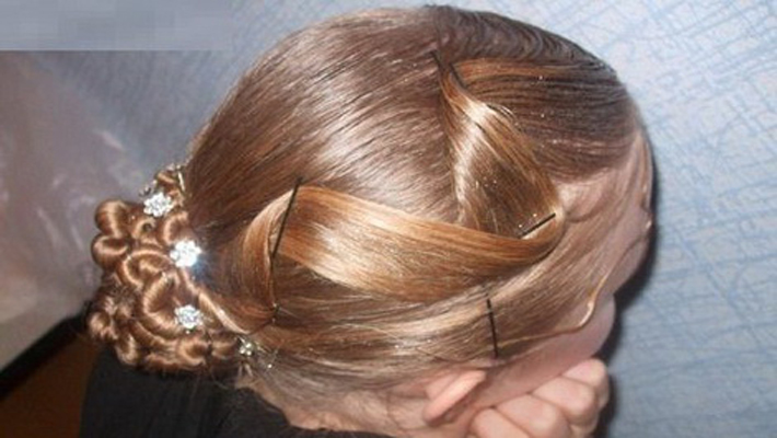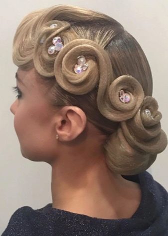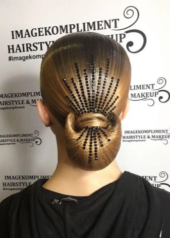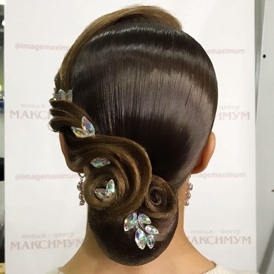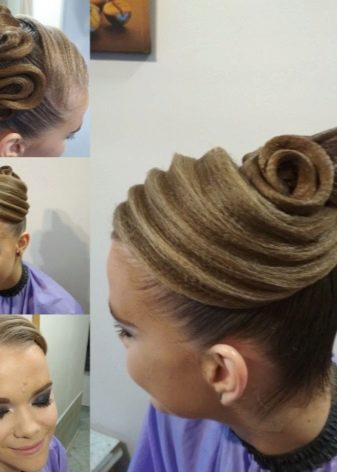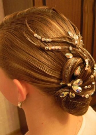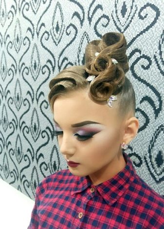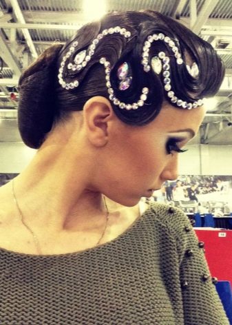 Girls over 15 years old are allowed to decorate styling for performances with additional elements. It can be rhinestones, ribbons, various hairpins and stones, nets and even feathers. All these elements are attached to varnished hair with a special glue that fixes them well. Do not abuse the large and shiny elements, they will look too defiant and cumbersome.