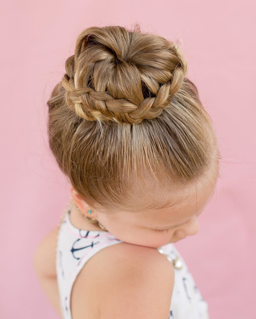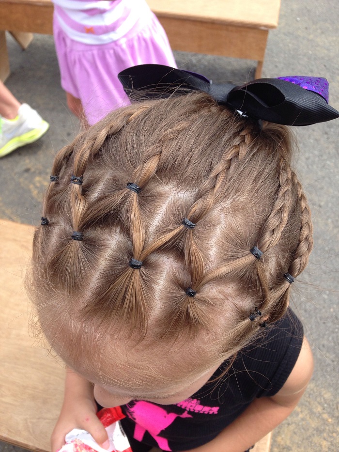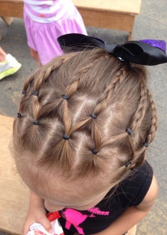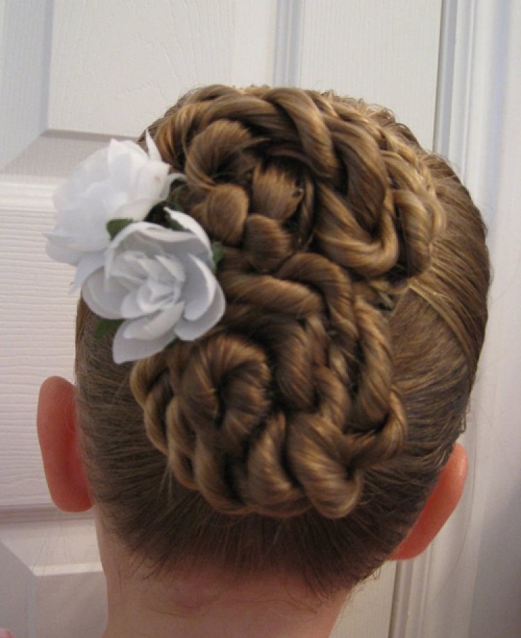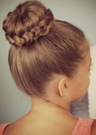 For very young dancers perfect hairstyles with weaves and high beams. They can be decorated with small hairpins or thin ribbons that fit the costume.
