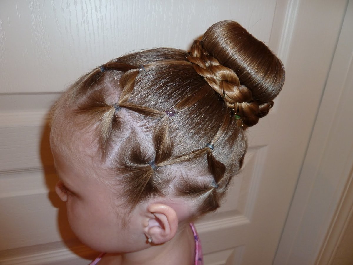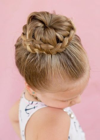 Boys and girls up to 7 years old fall into this category. Baby hairstyles should be as simple and convenient as possible. Most often these are various bunches, braids and “buns”. Hairpins and hairpins with artificial flowers that do not shimmer or shine can be used as decorations.