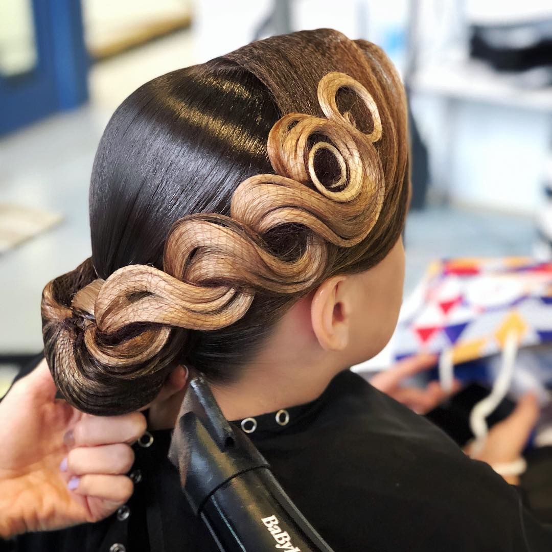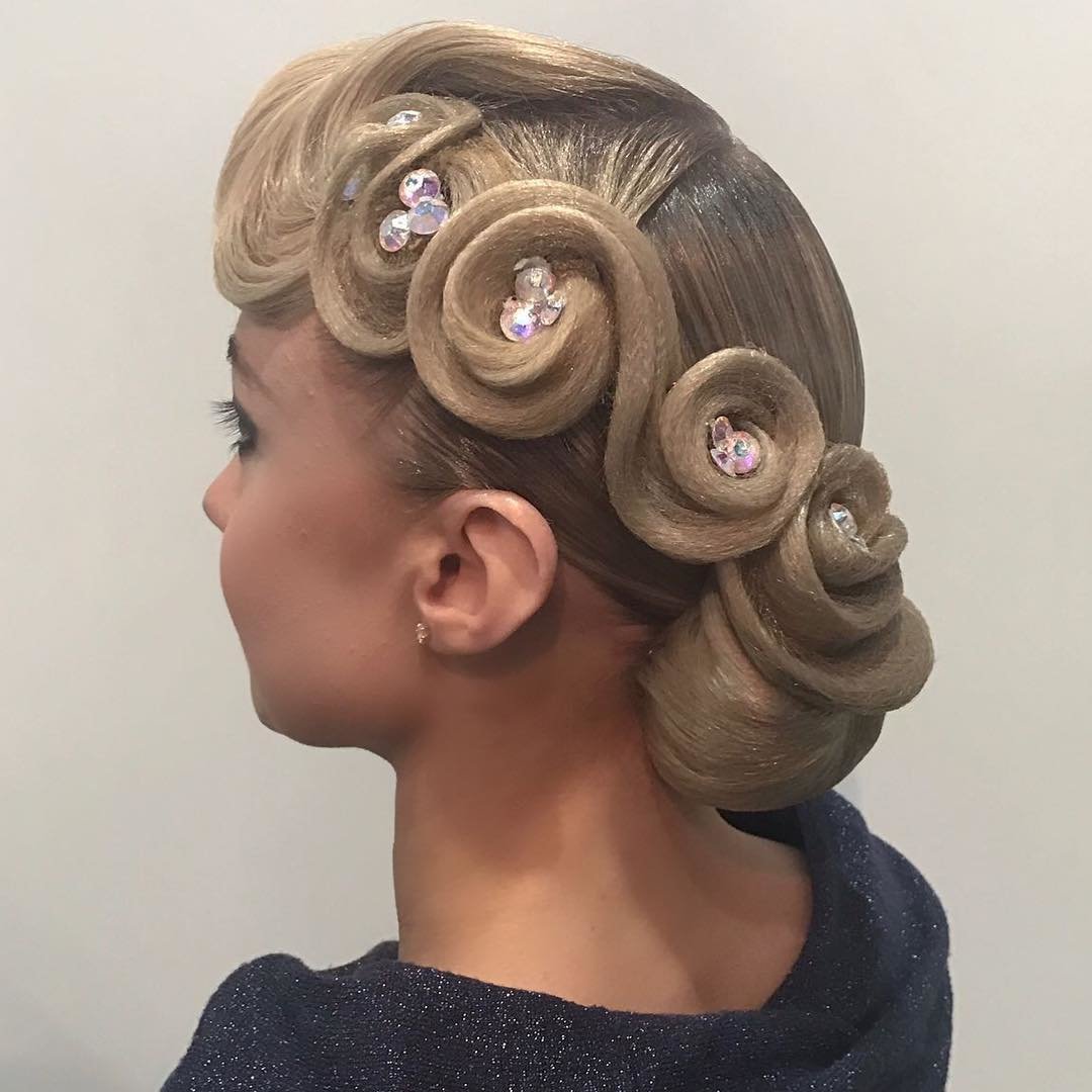 Like a bun, this hairstyle is a classic for ballroom dancing. It looks great on medium and long hair, and with a certain skill, you can put even rather short hair in a shell.