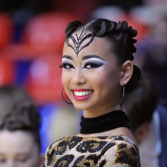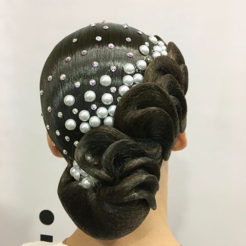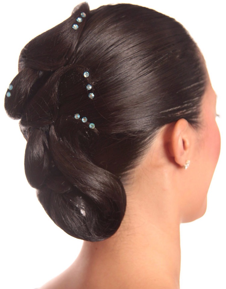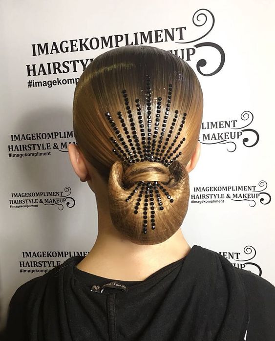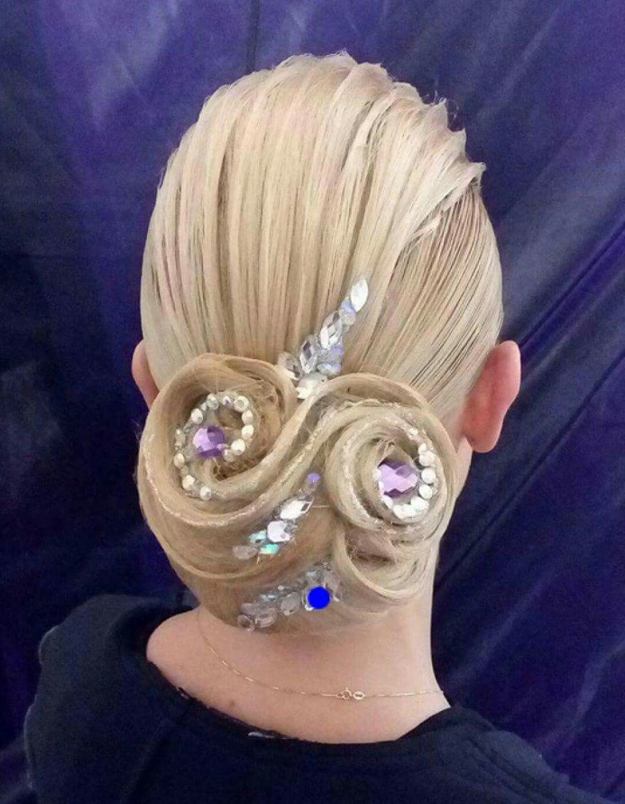 Dancers from 16 years old to 21 years old fall into this category. For them allowed the use of various chignons and artificial strands.Hairstyles become more complex, ornaments are plentiful. The hairstyle is often used stones and fabric, which were used when sewing a competitive costume.