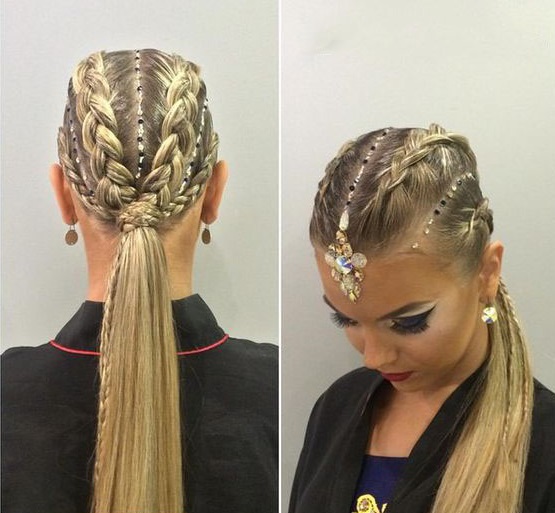 Tight harnesses of various volume, laid in a complex high hair, most often used by more experienced athletes. This hairstyle requires a more complex image, a brighter make-up and a thoughtful suit. Especially well plaits look on dark, almost black hair in combination with dark skin.