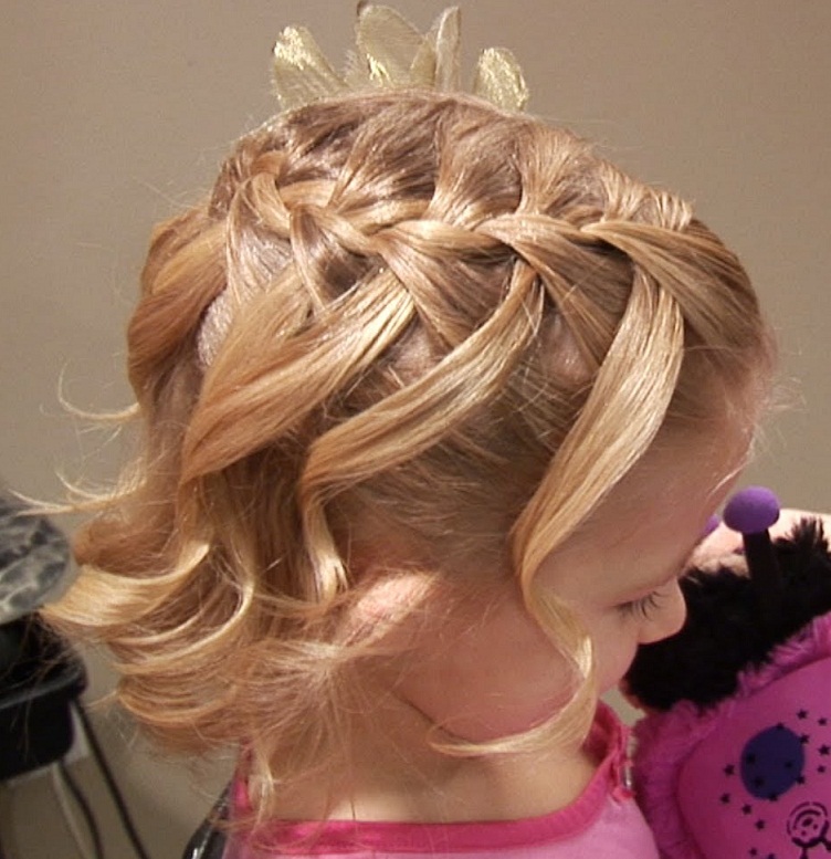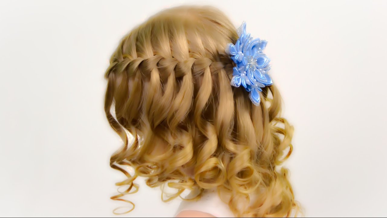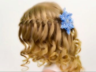 Carefully comb the child's hair and comb it on the right side, making the side parting. Fix the tail with a rubber band (silicone). We divide it into 3 parts and select the middle one. We weave a thin braid and fasten its ends with a thin elastic band. We put the braid around the base of the tail in the form of a flower and fix it with pins. The rest of the tail strands curled on curlers. This hairstyle is perfect for New Year's photo shoot.