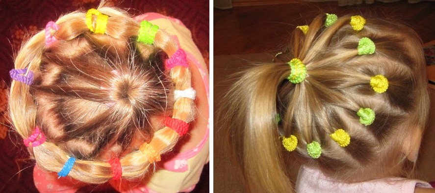 We comb the child's hair and divide it with a length parting (naughty strands can be slightly dampened). We divide each of the parts in half (horizontally). Further, by analogy, we do the same with each of the sections (there are 4 of them). Thus, we get 8 strand. Each curl is fixed with rubber bands of different colors. We should have 16 small tails (in a circle). Their ends are collected in one tail and tied with ribbon. A bright "wreath" on the head of a young princess will not leave anyone indifferent.
