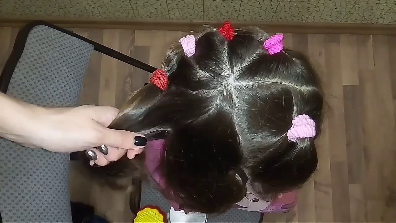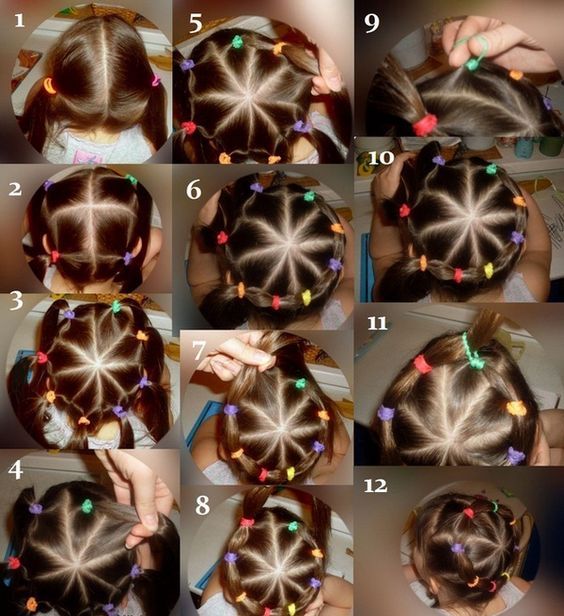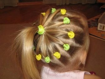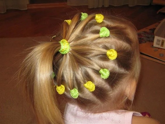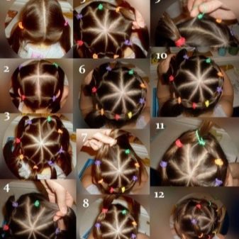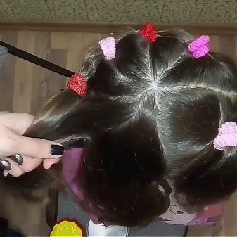 When all the hair is divided into 16 uniform parts, we tie them with rubber bands now completely.For these purposes, you can use both single-colored elastic bands and various color combinations, which will make the hairstyle even brighter and more original. The last step now is to put together all the resulting small tails and tie them together with one big rubber band at the top. Due to this solution, a significant part of the length of the hair is lost, and when assembled, they will definitely not climb into the face, and because of the abundance of gum, it is unlikely that styling will quickly fall apart even during active games.