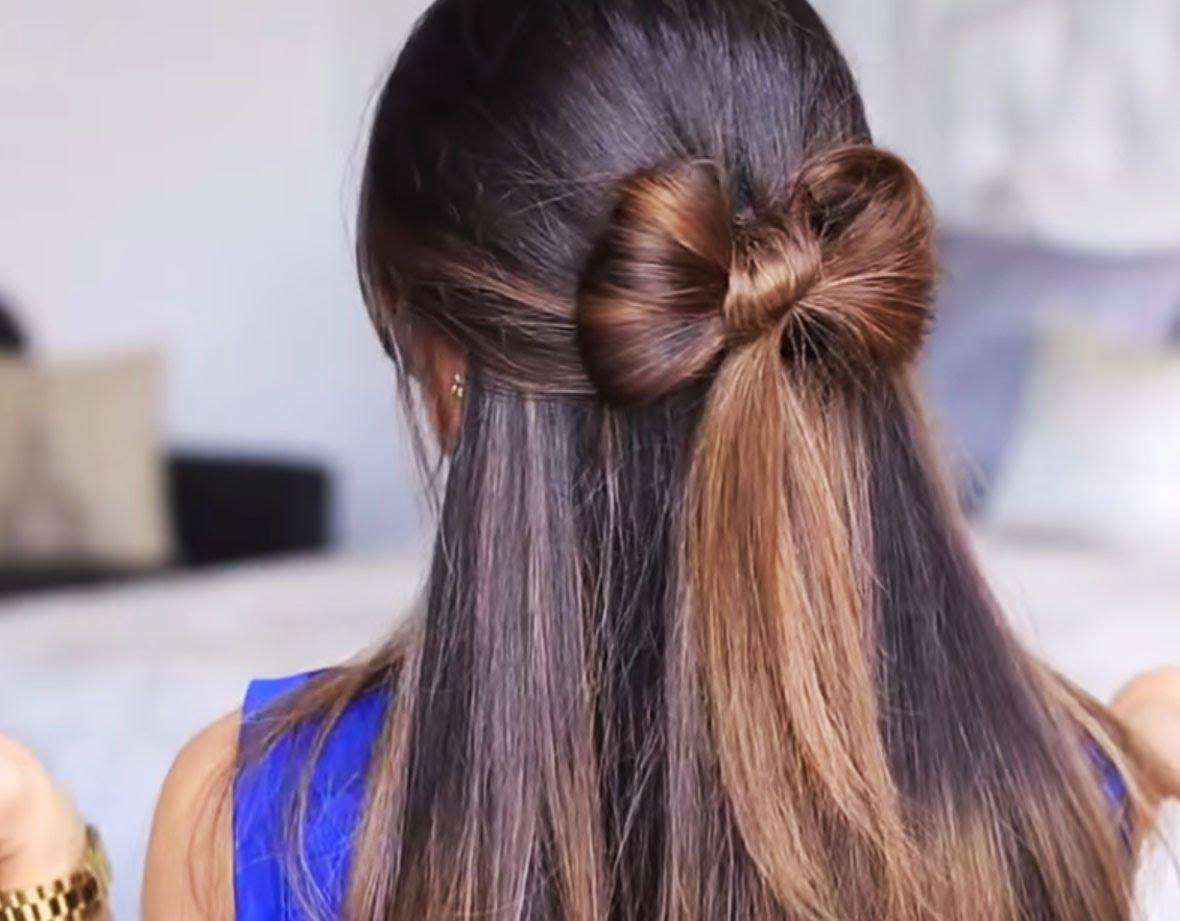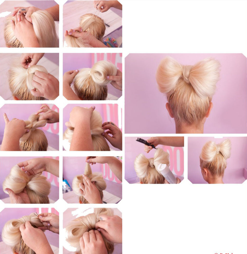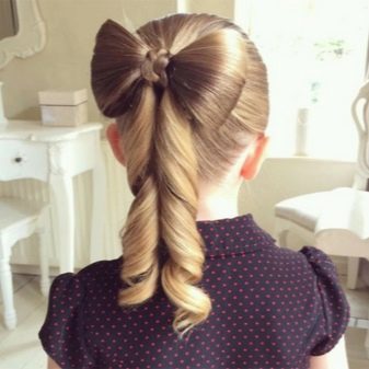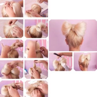 At first, the tail is made from the entire mass of hair on the crown, but it is not completely pulled out of the gum - a loop should result. We divide this loop in half, spreading its halves to the sides - from this, our bow should turn out, and we tie up the isthmus between them with the remaining end of the tail. For a perfect look, you can “pokoldovat” with the tips of the hair, hiding them under the halves of the bow and stabbing them there “invisible”;