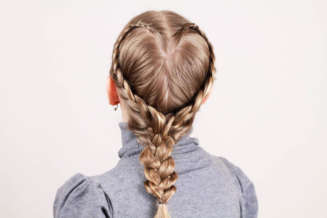 The peculiarities of the formation of such a hairstyle depend precisely on the final location of the “heart”, but for an example we consider its location on the back of the head. The first part is formed from the center of the forehead to the neck, one of the sides of the future hairstyle is going to elastic, so as not to interfere with the preparation of the first side. From the remaining hair around from the top of the crown they form a French braid, weaving into it strands only from the outside - this will make it curl in the right direction, as a result of which it will begin to resemble the heart. Naturally, half of the hair will make only half of the “heart”, so when the desired figure is reached, it's time to tie a pigtail with an elastic band and do the same manipulations on the other side.