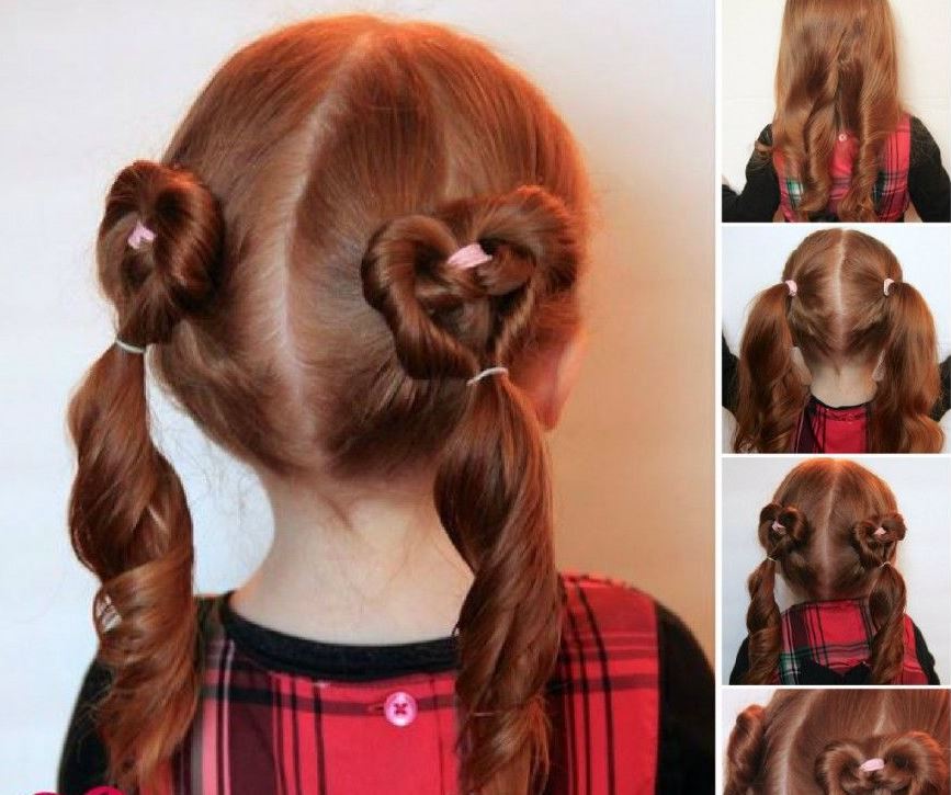 This hairstyle looks very interesting, while making it quite simple.First you need to collect two identical tails on the sides of the hair, and twist their tips through the gum; after that, each tail is divided into two sections, twisted into flagella and connected with elastic bands, so that they create a kind of heart - this is a very elementary hairstyle, but it will certainly create a little beauty a good mood for the whole day.