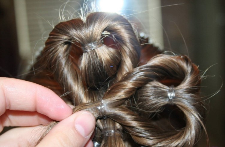 - Each section must be arranged in a tight harness so that it reaches approximately to the crown, after which it is fixed with a soft elastic to match the color of the hair, the tail should not be hidden.