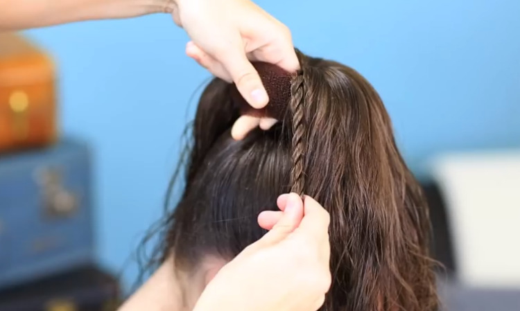 - Hair should be collected high in horsehair, secure with a rubber band, and then wear a foam roller to match the shade of the hair, it is pulled as close as possible to the base of the tail.