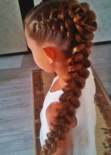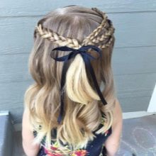 Make a parting on the head. Divide the curls into 2 equal parts and from each select one thin strand. Both strands must be crossed with strands from their part, and then cross with each other. From one side, once again select a thin strand and cross over with the upper strand of the resulting braid. Alternating the sides in a similar way, the braid is braided and fixed with an elastic band. A small bow with a barrette is fastened near the base.