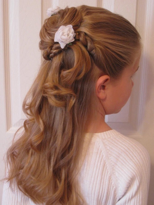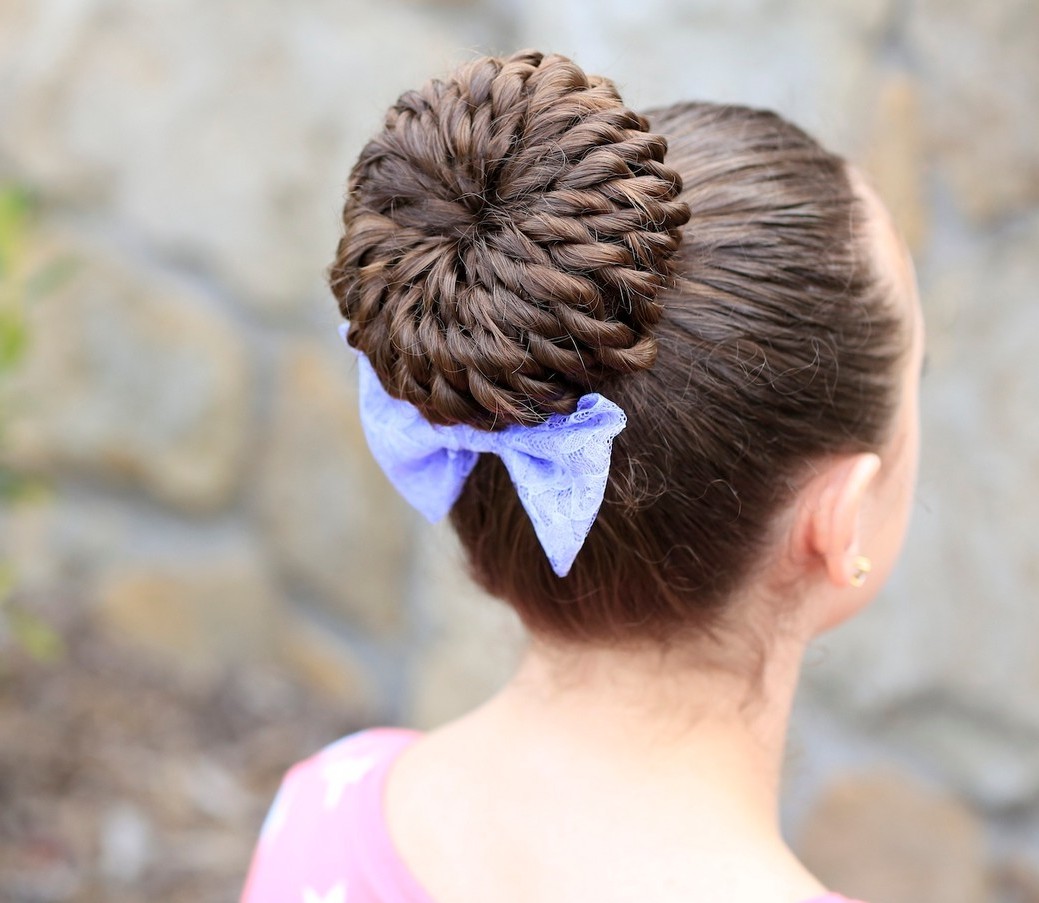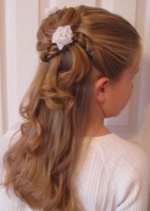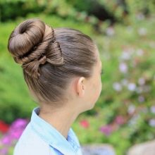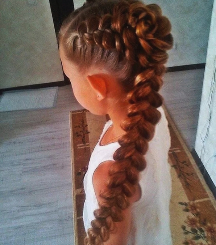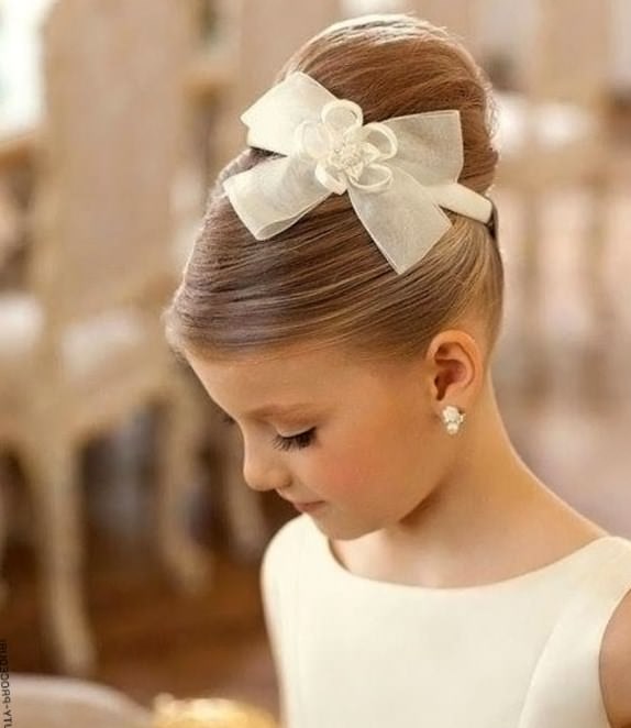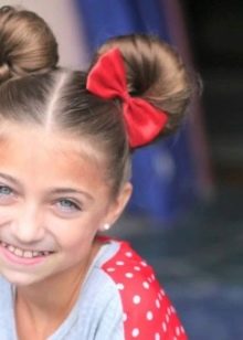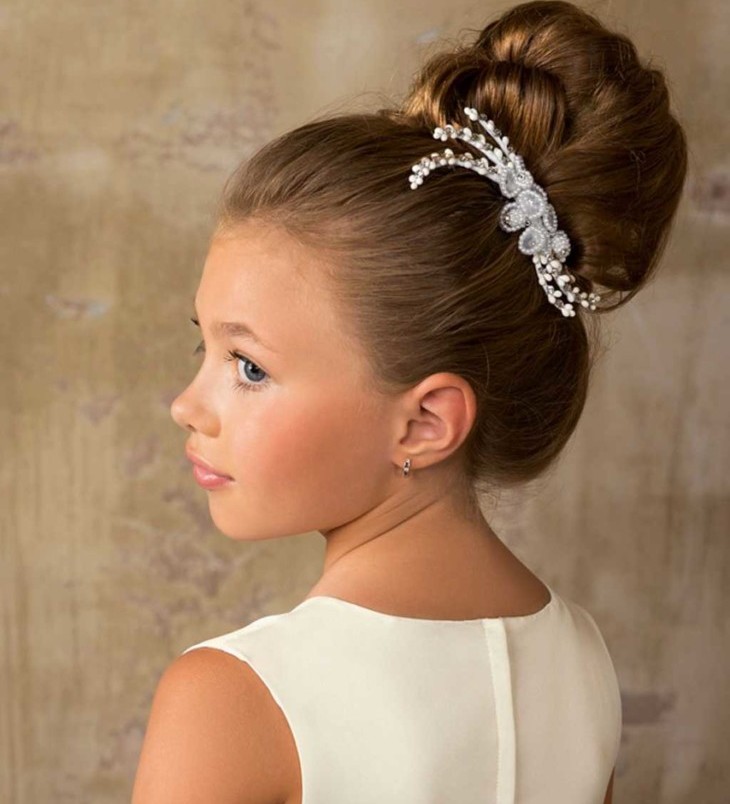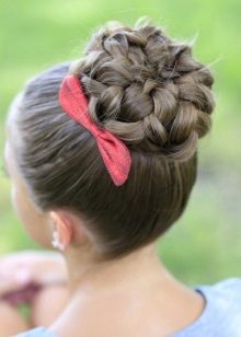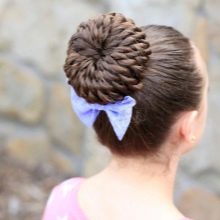 This is a truly legendary hairstyle, it is usually done for some solemn occasions, as a child’s everyday it is not suitable. It is necessary to act as follows. Hair collected on top of a high horse tail. Strands are divided into two parts of different thickness. A large mass of hair is combed out, a lush beam is formed and fixed in a bun, and not combed ones are placed on top of the whole structure and fixed with pins.