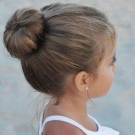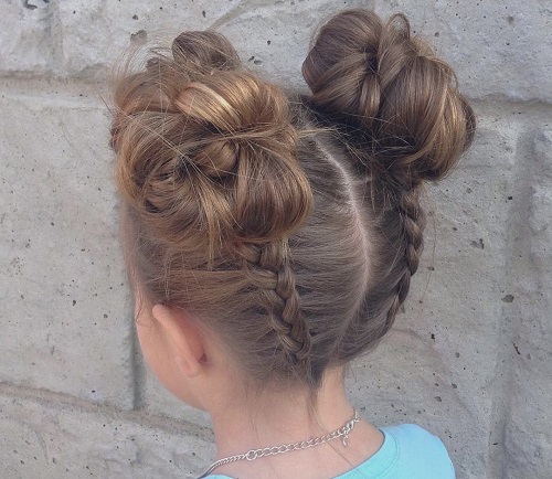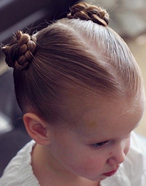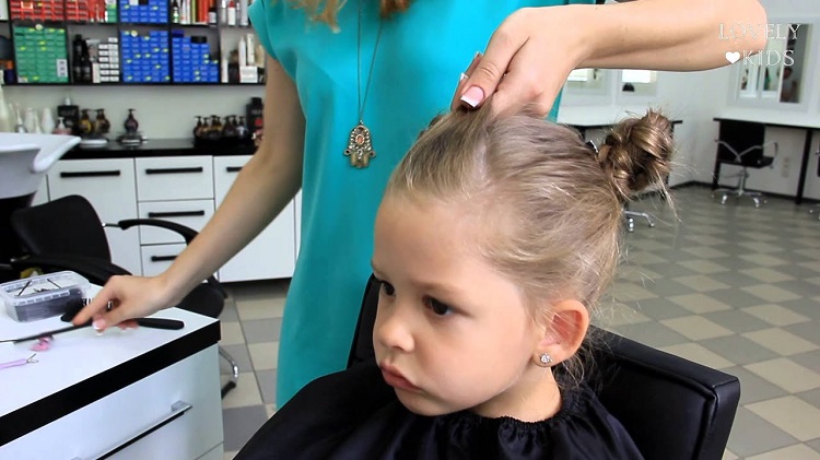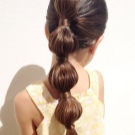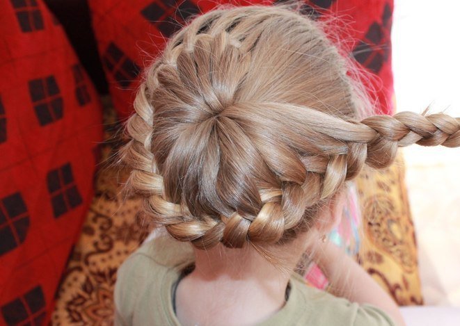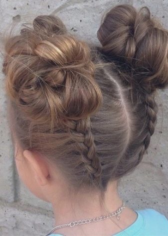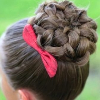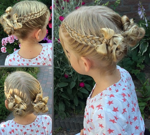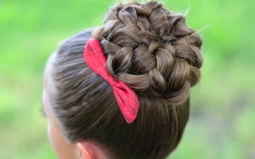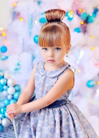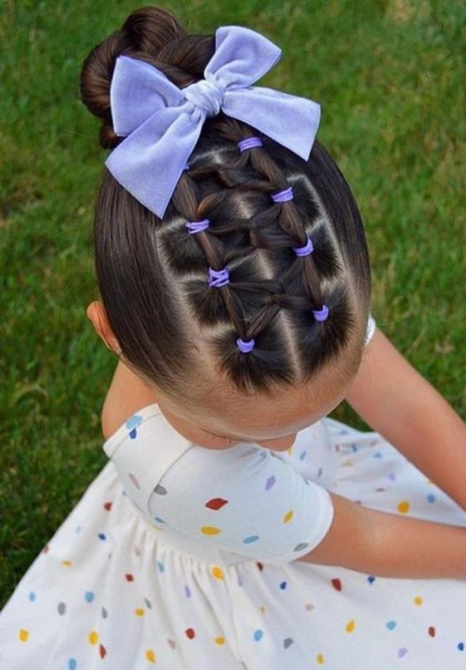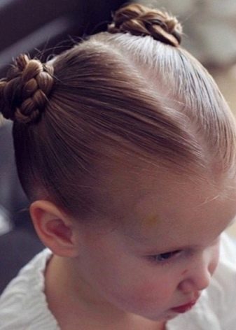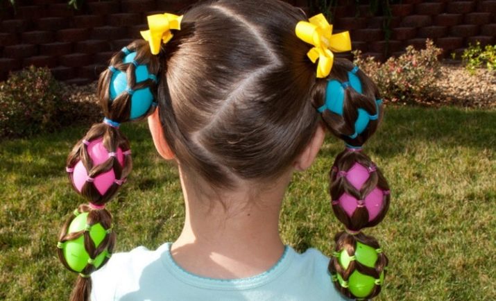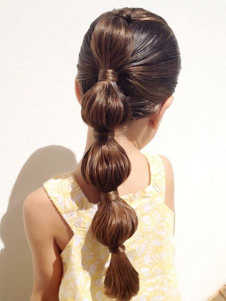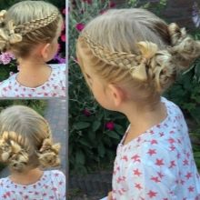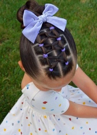 For a little girl, a hairstyle of knots and a bun will do. The hair in the parietal and temporal areas divided into six parts, fix them with colored bands. In the middle of each tail, make loops and tighten into knots. Collect the free part of the hair in one bundle and fix.